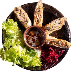 Summer rolls filled with rice noodles, lettuce, cucumber, and Vietnamese herbs, served with a spicy lime dip